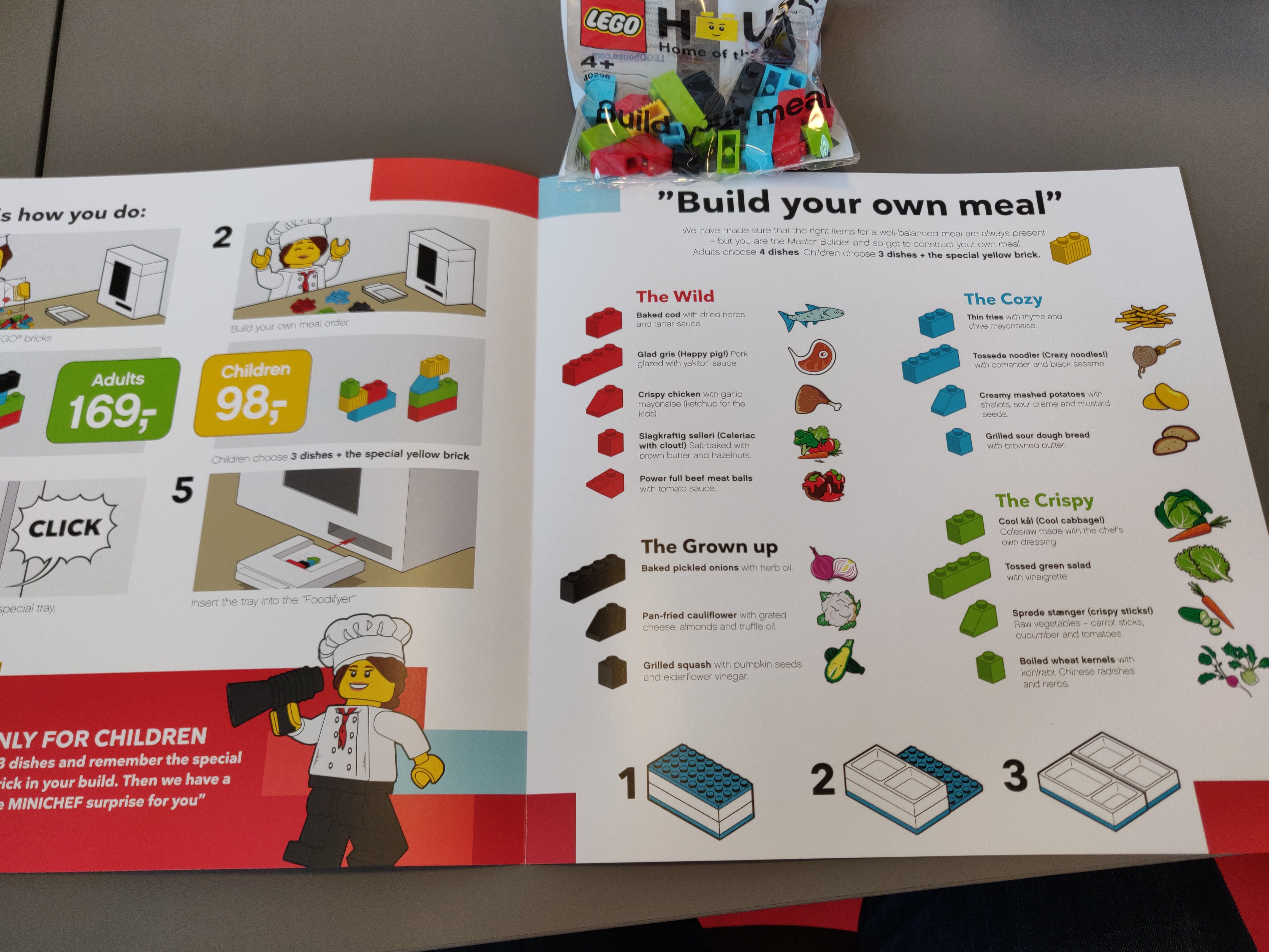 Mini chef ? C'est quoi ? C'est un des restaurants de la Lego house que nous avons testé et approuvé ! On compose ce que l'on veut manger en lego selon un code couleur et de forme ! Puis on l'insère dans un petit boîtier sur notre table pour commander ! Il faut ensuite aller chercher notre plat qui arrive... dans une grosse boîte Lego que des robots nous envoient ! Nous sommes retombés en enfance et en plus c'était super bon ! Tout le monde s'est régalé.