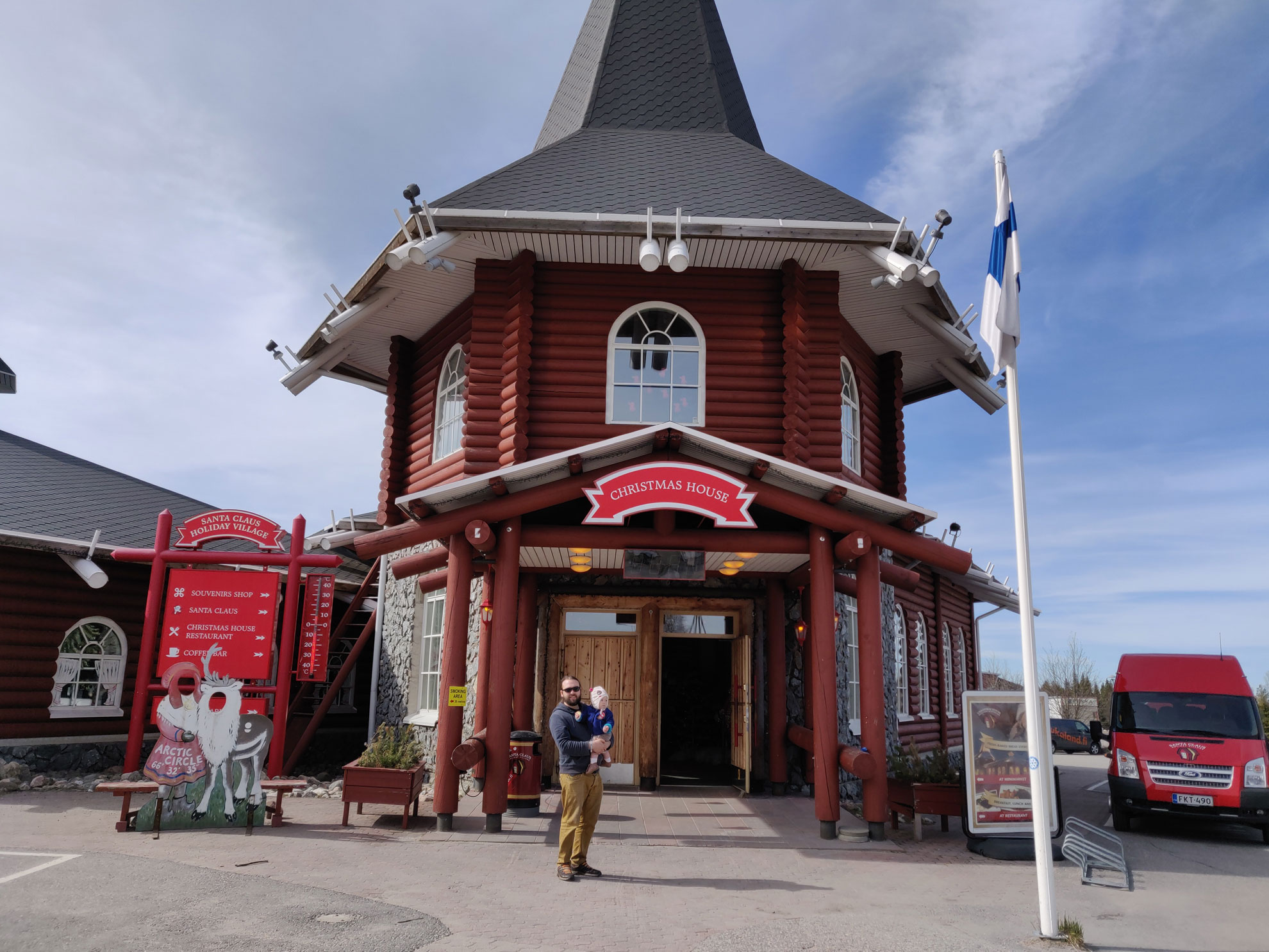 Nous sommes arrivés en Finlande, à Rovaniemi. C'est là qu'habite le père Noël ! C'est aussi le passage du cercle polaire arctique ! Cécile a vu le père Noël pour la première fois, il parlait même un peu français ! C'était très calme, c'est le creux de la saison touristique au mois de mai. C'est quand même une grosse usine touristique (plus de magasins que de choses à faire, 30€ la photo avec le père Noël...) mais ça vaut quand même le détour car les décors sont magiques.