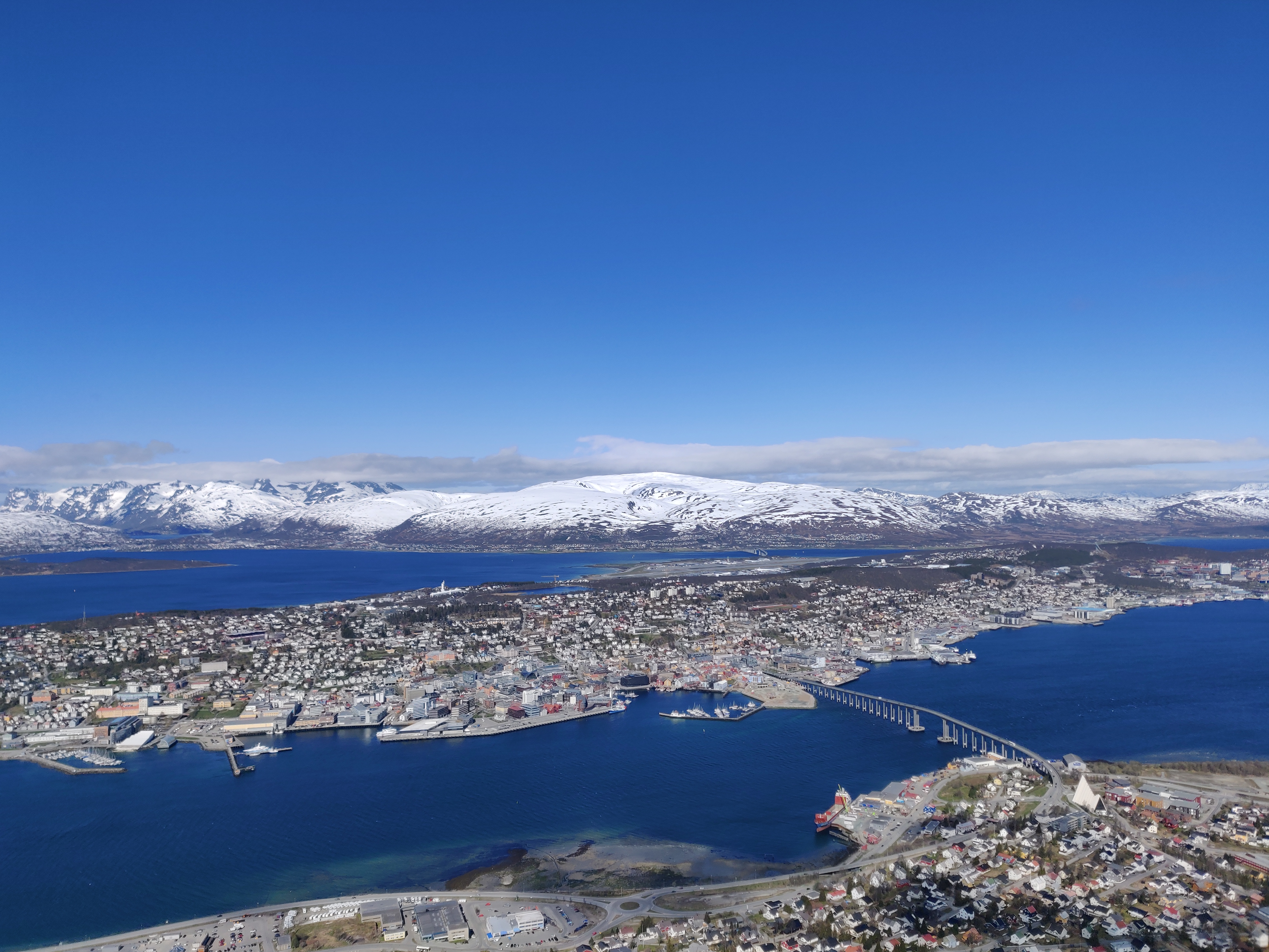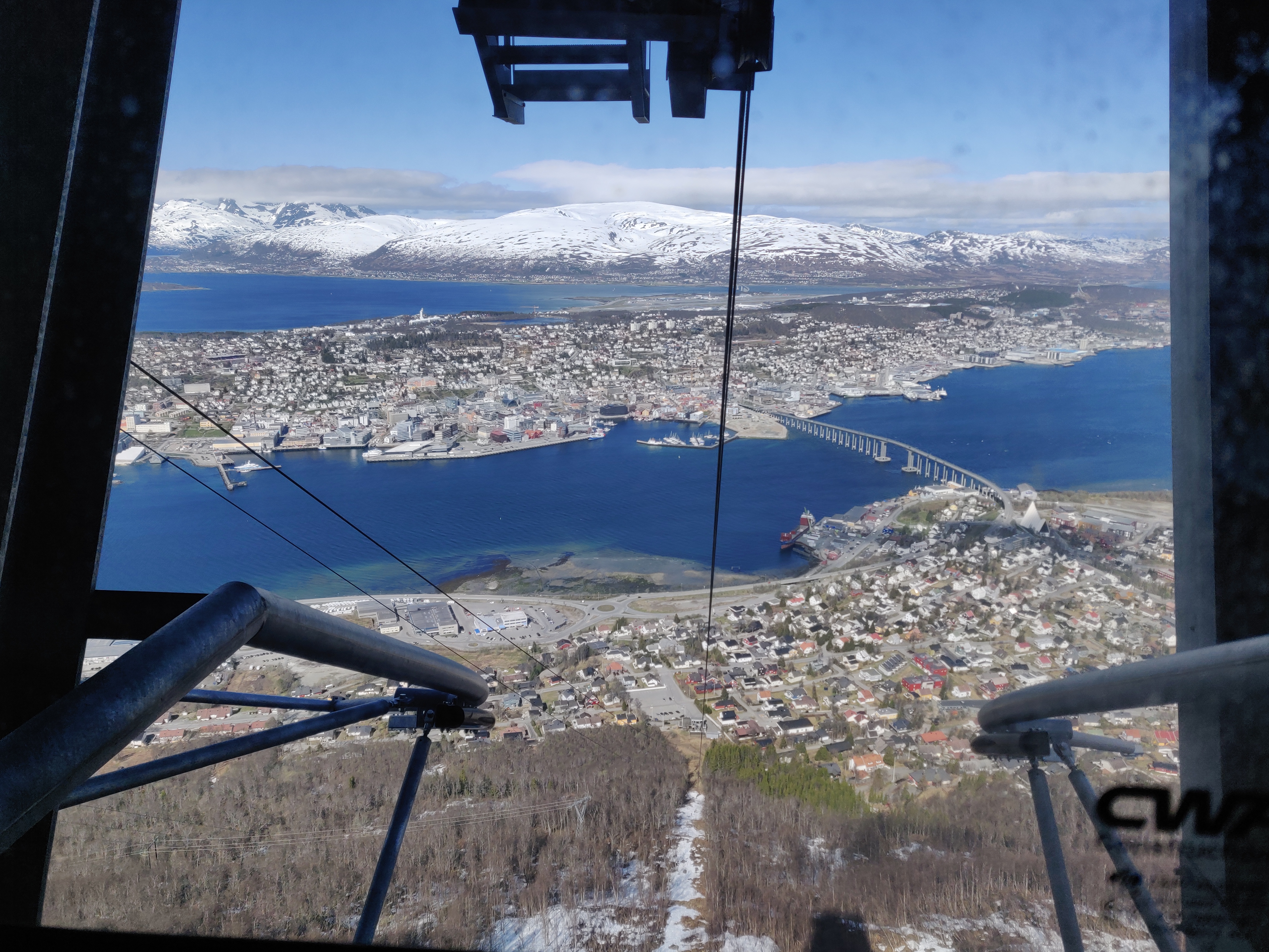 Tromsø est la "capitale" du nord de la Norvège. Nous y restons une nuit et logeons au camping (on a eu les dernières places avec électricité, ouf!), on en profite pour faire tourner une machine à laver (10€! la Norvège nous semble très chère) ou encore faire du pain maison dans la cuisine partagée (merci Denis!). Nous sommes allés voir la cathédrale Arctique qui malheureusement était fermée le matin à cette époque. Puis nous avons fait un trajet au bord d'un téléphérique nous amenant à 400 mètres d'altitude avec une vue magnifique ! Déconseillée à ceux qui ont le vertige !